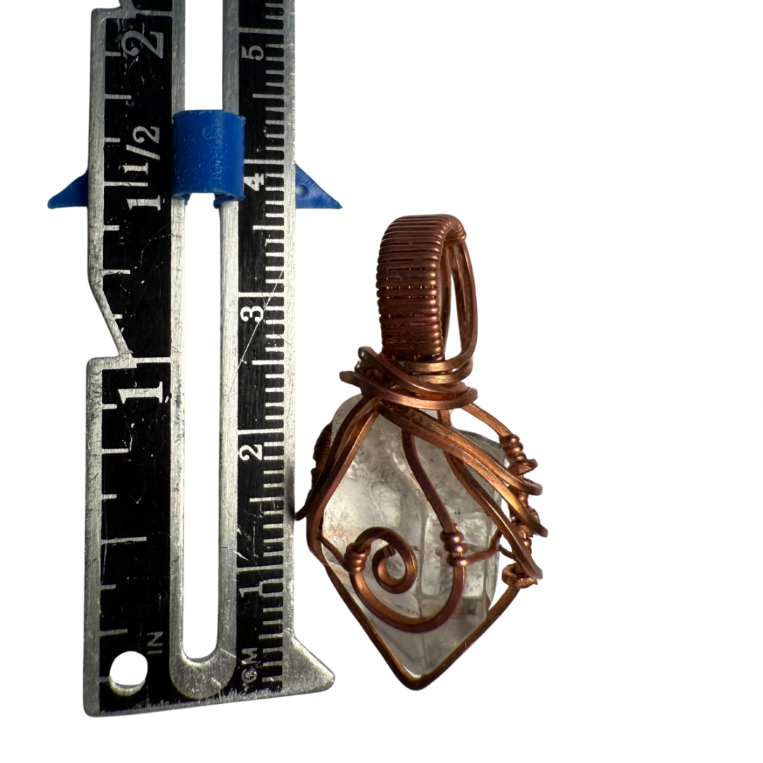 Elevate your style all the while maintaining your clarity and mental focus. Copper is believed to be a conductor because of its flow energy and ability to move stagnant energy. Now combine that with the versatile clear quartz often called the master healer, making this a high flow energy tool. This beautiful handmade crystal quartz wrapped in copper is modeled by the designer.
